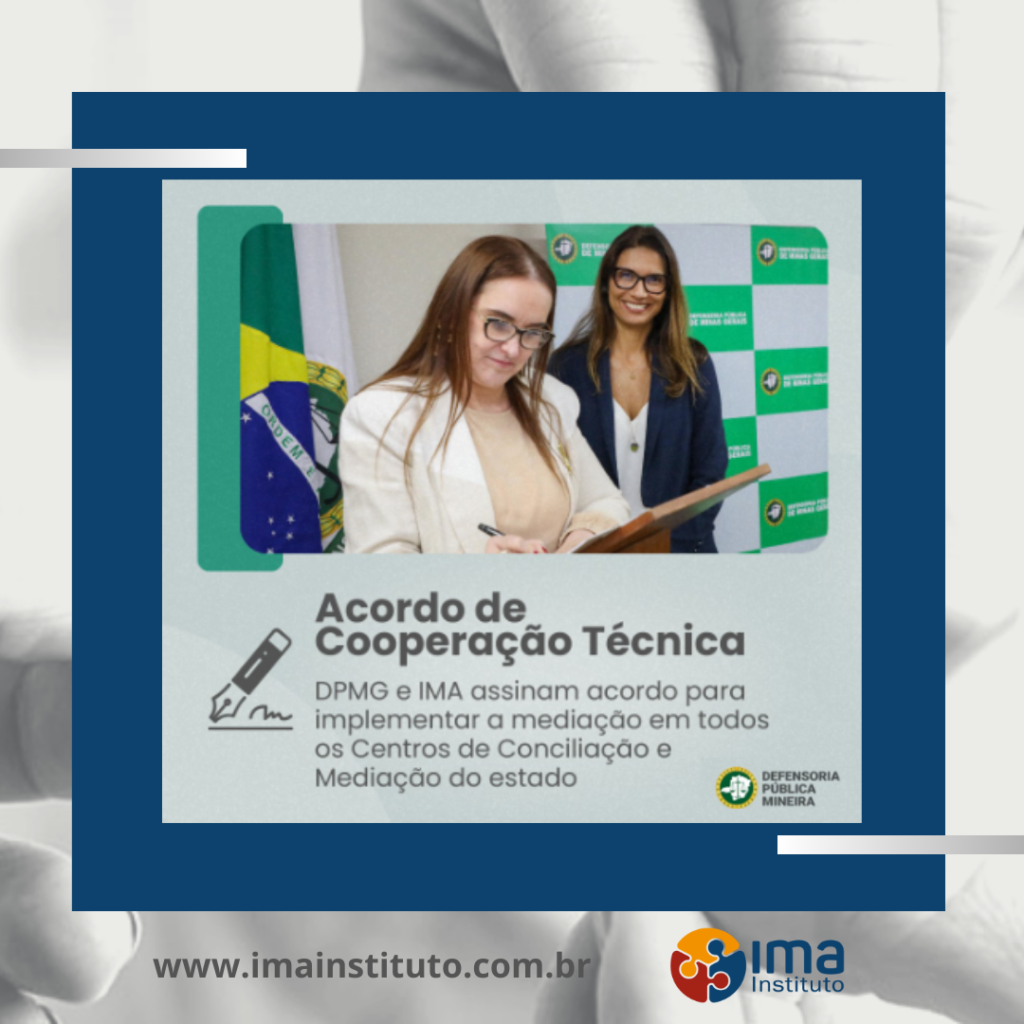 A Defensoria Pública de Minas Gerais, por meio da sua Coordenadoria de Projetos, Convênios e Parcerias (CooProC), e o Instituto de Mediação Aplicada (IMA) firmaram Acordo de Cooperação Técnica (ACT) para ampliação dos métodos consensuais e extrajudiciais adequados de tratamento de conflitos disponibilizados pela DPMG para suas assistidas e assistidos.